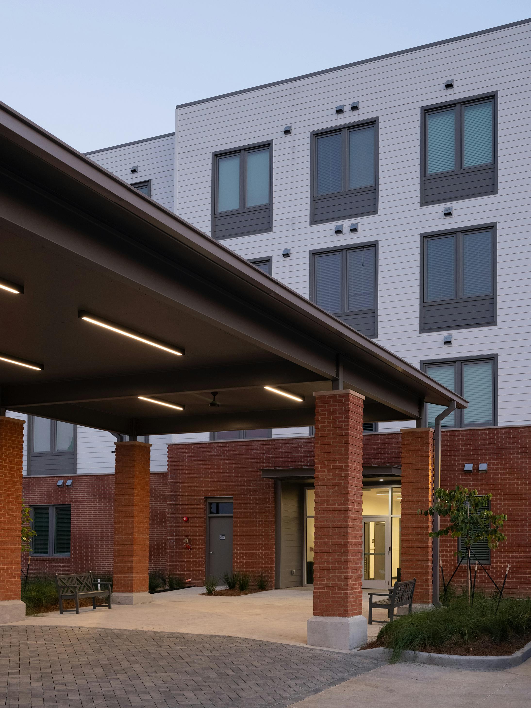 Riverside Retreat, the first new residential building on the site since the Navy’s departure in 2011, provides affordable housing for low-income seniors, meeting a critical citywide need. The new 4-story, multi-family apartment complex offers affordable housing prioritizing low-income seniors, championing economic inclusivity and aligning with the district’s master plan to create a walkable, mixed-use urban neighborhood. This building is funded by the Louisiana Housing Corporation’s Low Income Housing Tax Credit (LIHTC) pilot program and aims to meet high sustainability standards, including Fortified Gold and Green Enterprise Communities certifications.